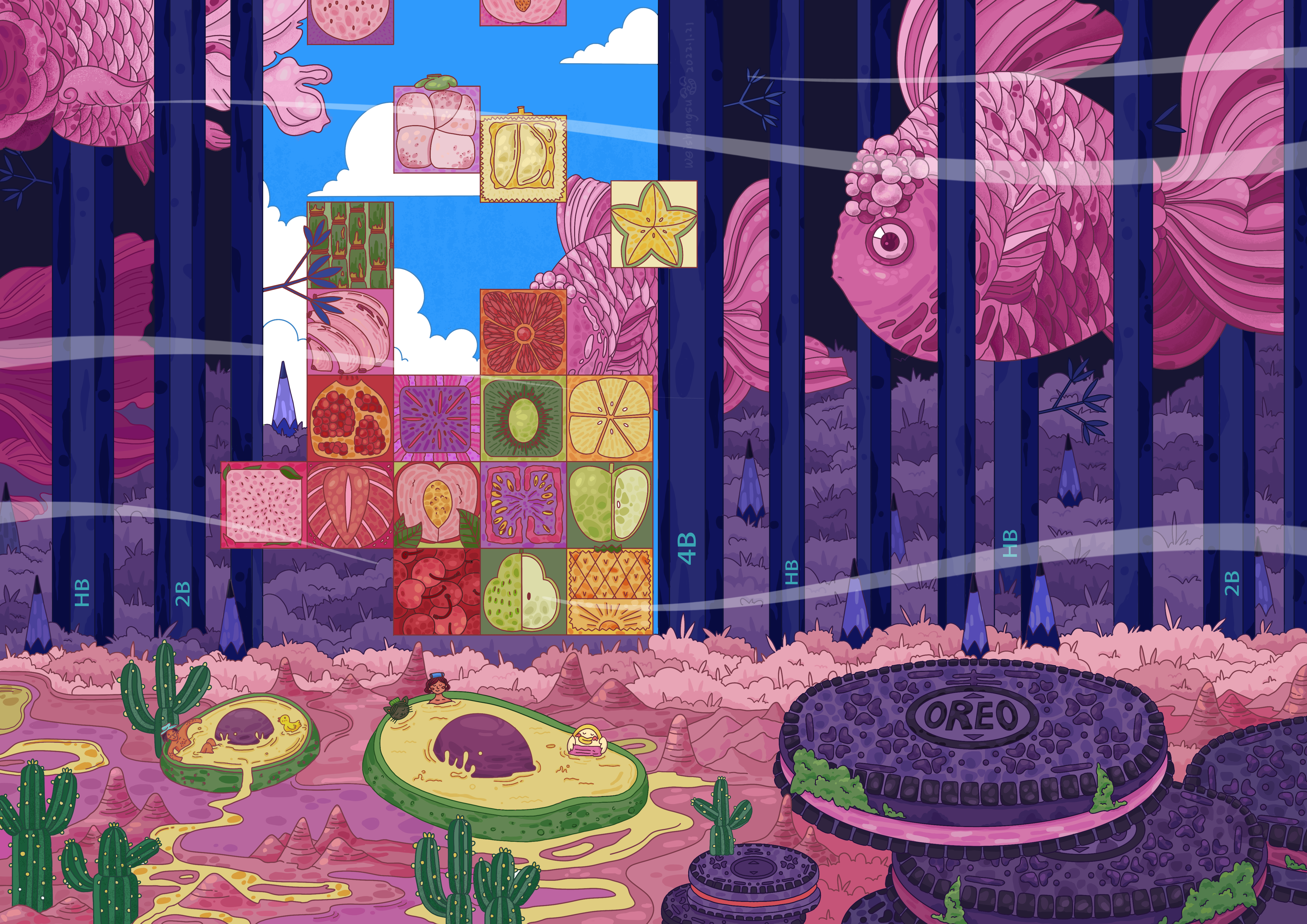 在这个属于女孩的仲夏夜梦境中,她看到了自己最心爱的金鱼穿梭在由创作铅笔构成的森林里,地上草莓夹心的奥利奥饼干散发着清新的香气。