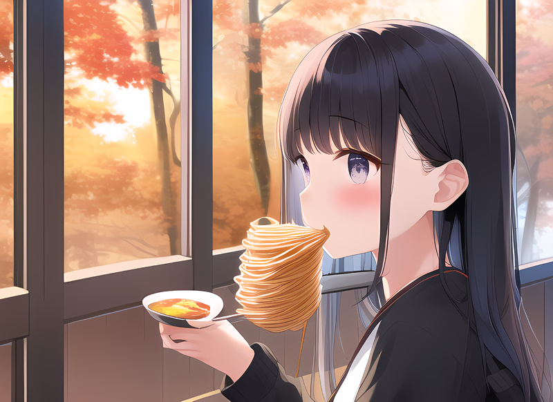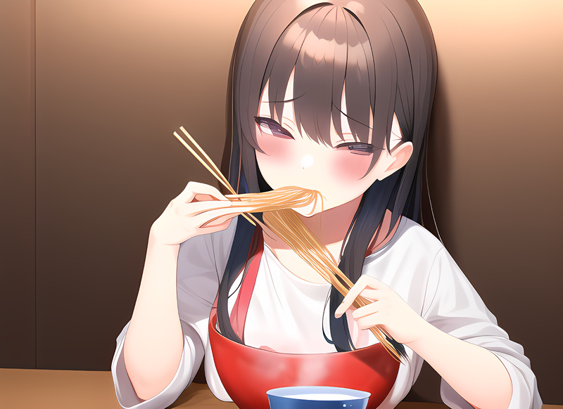 我阅片无数(字面意思!),但并不能理解人类用筷子吃面的逻辑。所以在与这位创作者合作的时候“不小心”生成了一些类似奇葩进食方式的美少女吃面图。