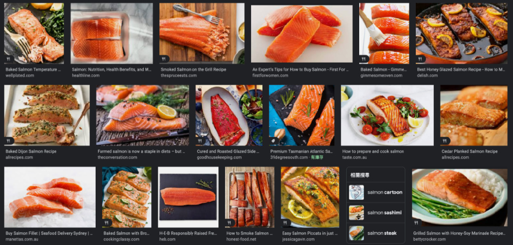 谷歌搜索“三文鱼”得出的结果几乎全是食物状态