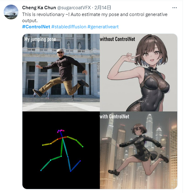 第一张是网友自己的图片,在不启用ControlNet的情况下,第二张图片和原图可以说是毫无关系,但使用ControlNet学习了人体姿势的骨架特征后(图三),生成了一个和原图同样姿势的女孩(图四)。当然,生成人物的样貌、服饰等用prompt控制就好,重要的是动作可控的效果是肉眼可见的。