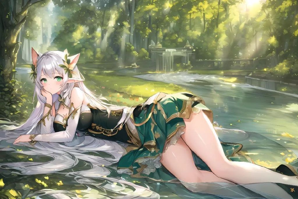 画面描述:(((masterpiece))), (((best quality))), ((ultra-detailed)), (illustration), ((an extremely delicate and beautiful)),dynamic angle,floating, (beautiful detailed eyes), (detailed light) (1girl), loli, small breasts, floating hair, glowing eyes, pointy ears, white hair, green eyes,halter dress, feather, leaves, nature, (sunlight), river, (forest),(painting),(sketch),(bloom)