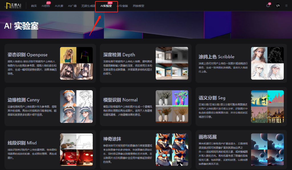 目前,无界的「AI实验室」已经上线了「姿态识别Openpose」「深度检测Depth」「涂鸦上色Scribble」「边缘检测Cnny」「模型识别Normal」「语义分割Seg」「线段识别Mlsd」七大工具,用户们不必自行部署就可获得ControlNet绘画体验,效果究竟如何,我们可以一起来试试!