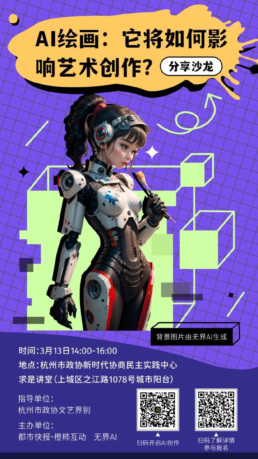 如果你对AI绘画感兴趣,希望了解它的前世今生和对行业的影响,3月13日(周一)下午2:00-4:00,在钱塘江边有一场分享会。