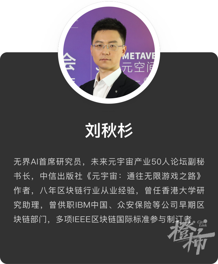 分享嘉宾刘秋衫是无界AI首席研究员,未来元宇宙产业50人论坛副秘书长,中信出版社《元宇宙: 通往无限游戏之路》作者。此前,他曾供职IBM中国、众安保险等公司早期区块链部门,参与多项IEEE区块链国际标准制订。