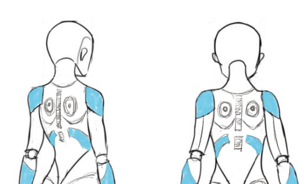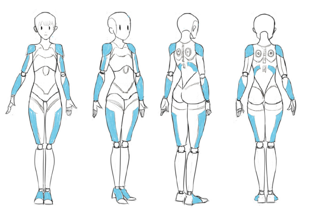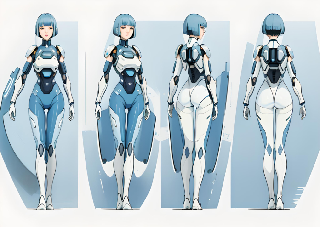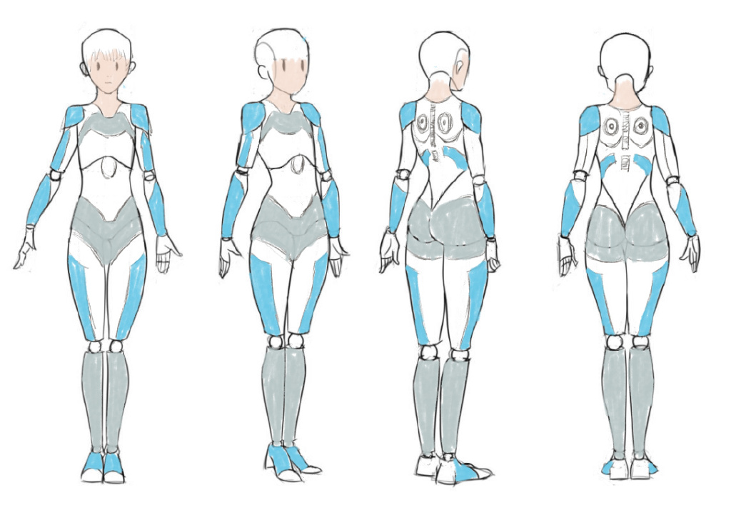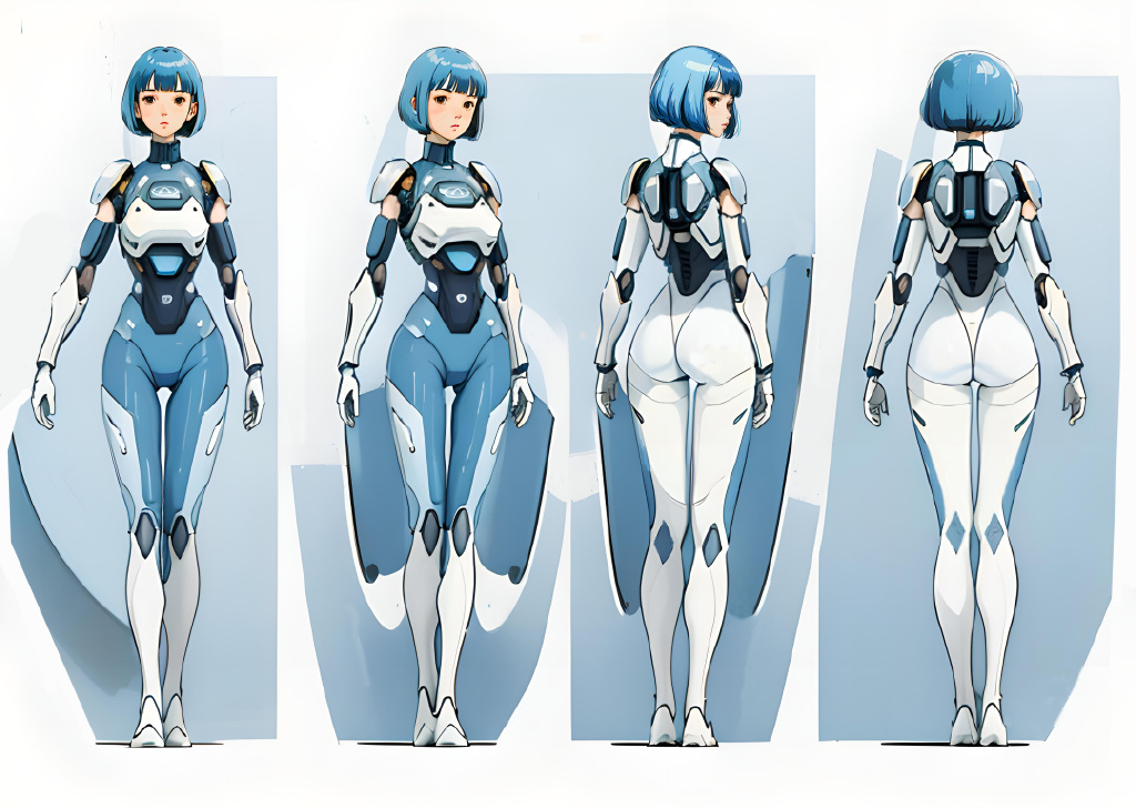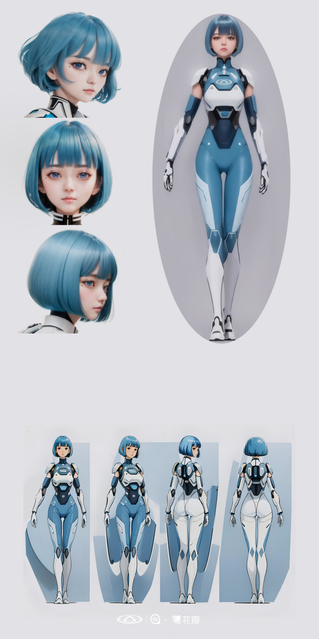 我最初的想法是想做一个半机械体的女性,拥有蓝色的鲍勃剪发型,这样会让角色看起来比较干练,干净,带有一些知性美。
