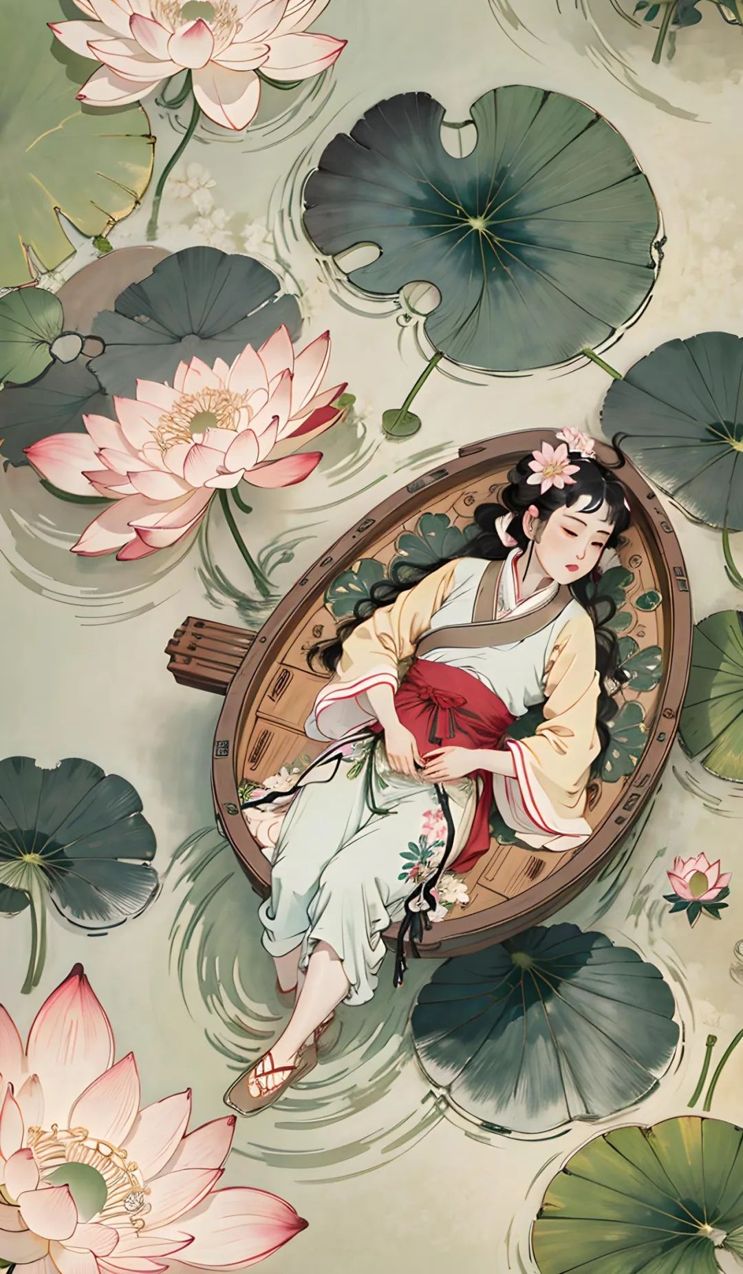 图三(Prompt): 高清壁纸,池塘,绿色的大片的荷叶,少量的淡粉色的荷花,一叶小舟,几个身穿汉服的诗人在船上,(清澈的池水),(远景)Model: 美漫, CFG scale: 7, Hires upscale: 1.5, LoRA: 写意(0.3)、水墨-1(0.3)、彩色连环画(0.45)、吉卜力(0.3)https://m.wujieai.com/s/P7S4ANCI一键复制后打开【无界AI】APP 或 点击链接 自动填入全部参数进行同款创作