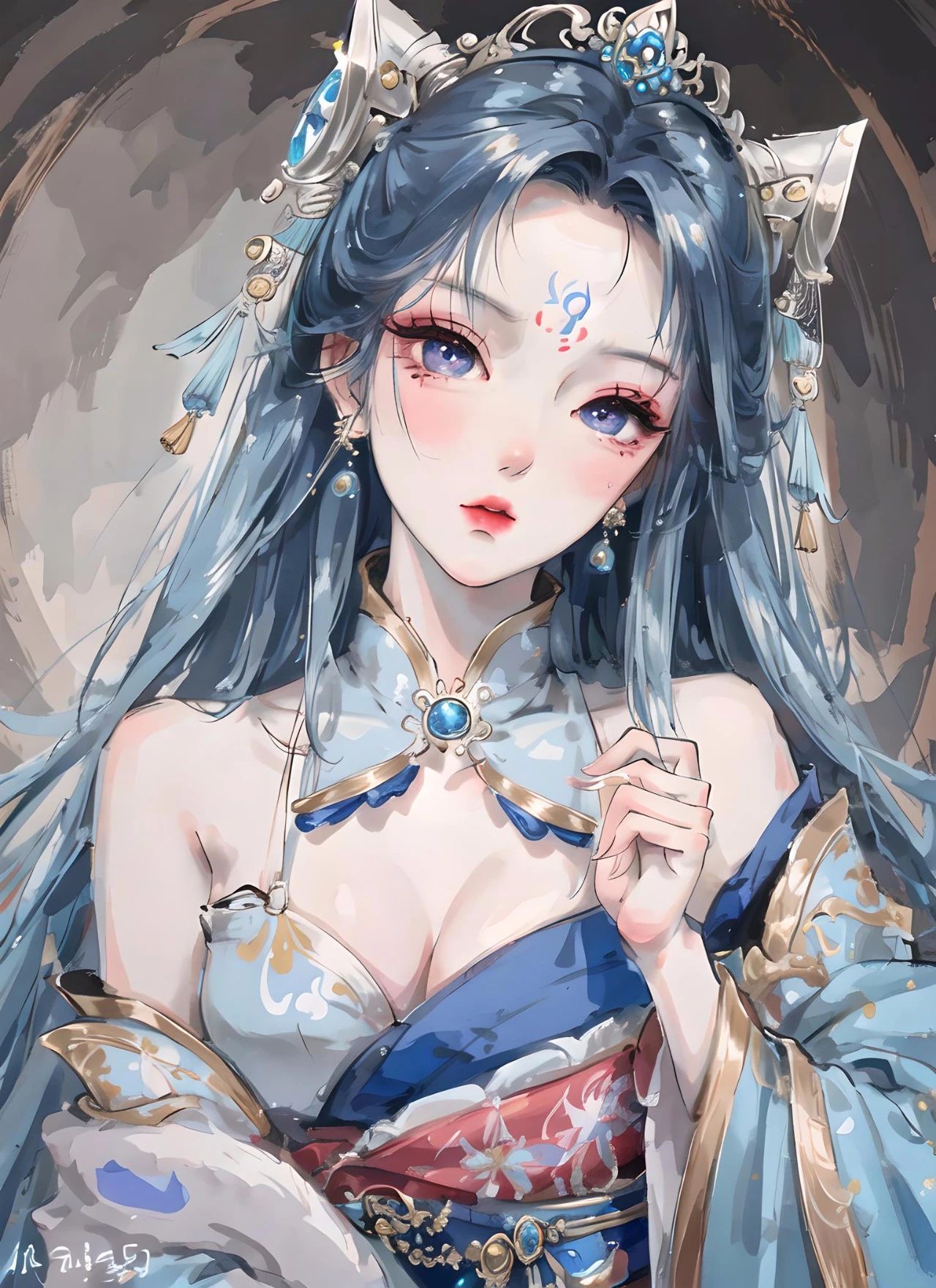 图五关键词:大师作品,最高画质,杰作,女生,汉服,波浪花纹,蓝色汉服,发簪步摇,珠宝首饰,妆容精致,美丽,精致的五官,完美的脸,发光的皮肤