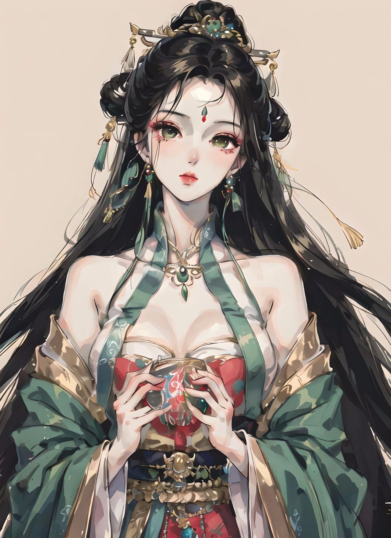 图四关键词:大师作品,最高画质,杰作,女生,汉服,翠绿色汉服,发簪步摇,珠宝首饰,朴素,黑长直发,妆容精致,美丽,精致的五官,完美的脸,发光的皮肤
