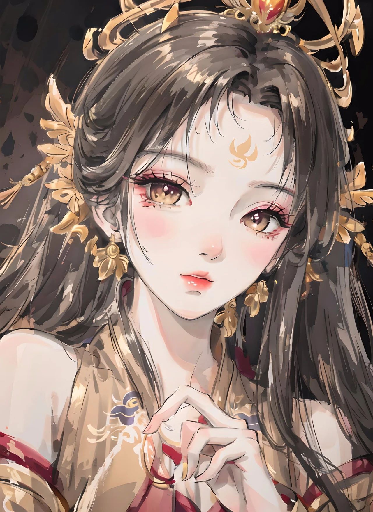 图三关键词:大师作品,最高画质,杰作,女生,华丽的汉服,镂金花纹,金色汉服,凤冠,发簪步摇,妆容精致,美丽,精致的五官,完美的脸,发光的皮肤