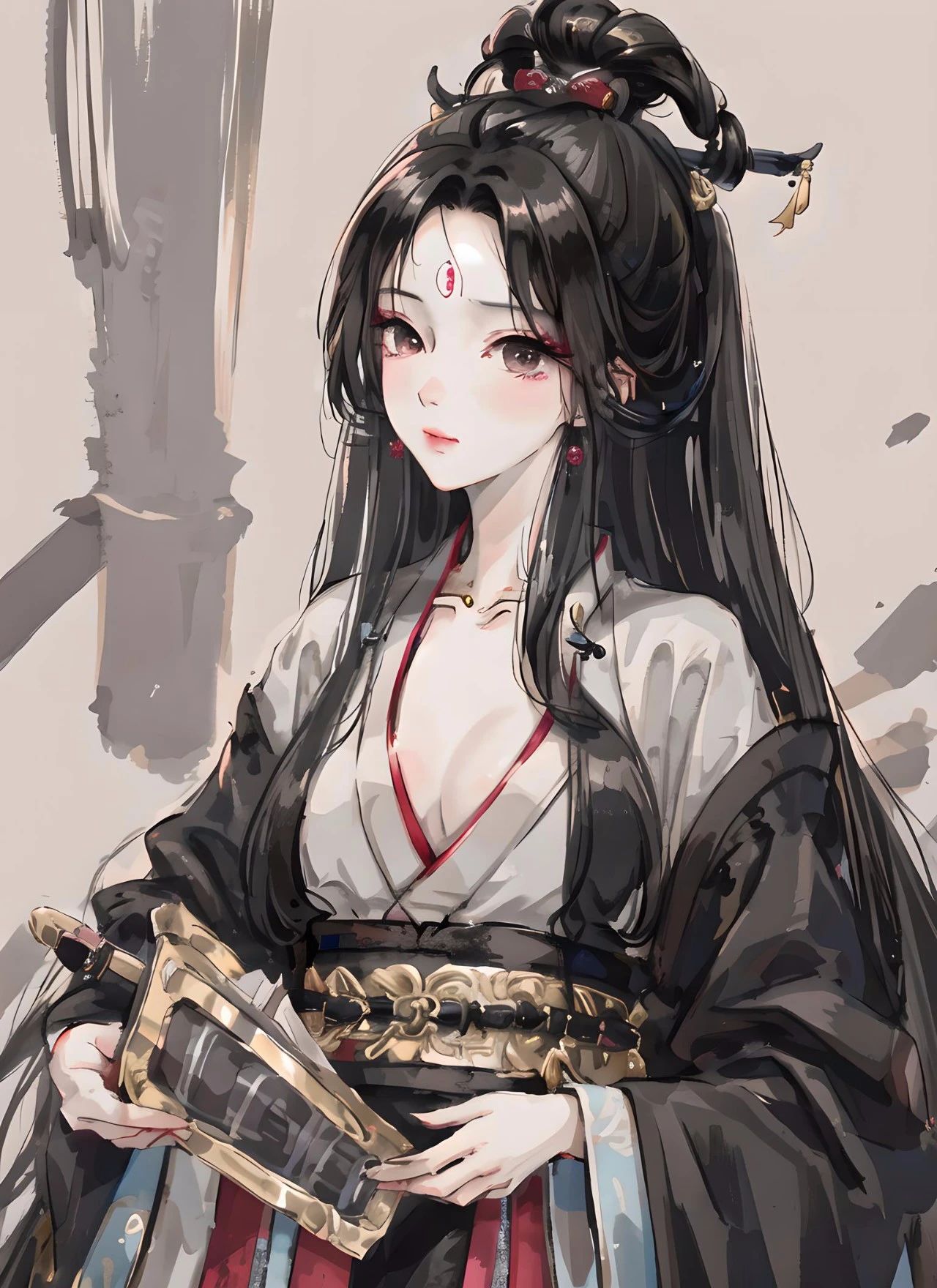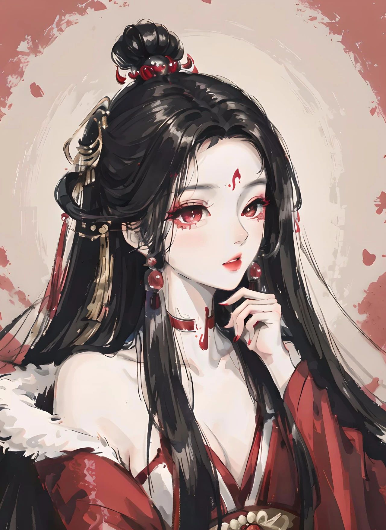 图六关键词:大师作品,最高画质,杰作,女生,汉服,黑红配色汉服,发簪步摇,珠宝首饰,朴素,黑长直发,妆容精致,美丽,精致的五官,完美的脸,发光的皮肤,微笑