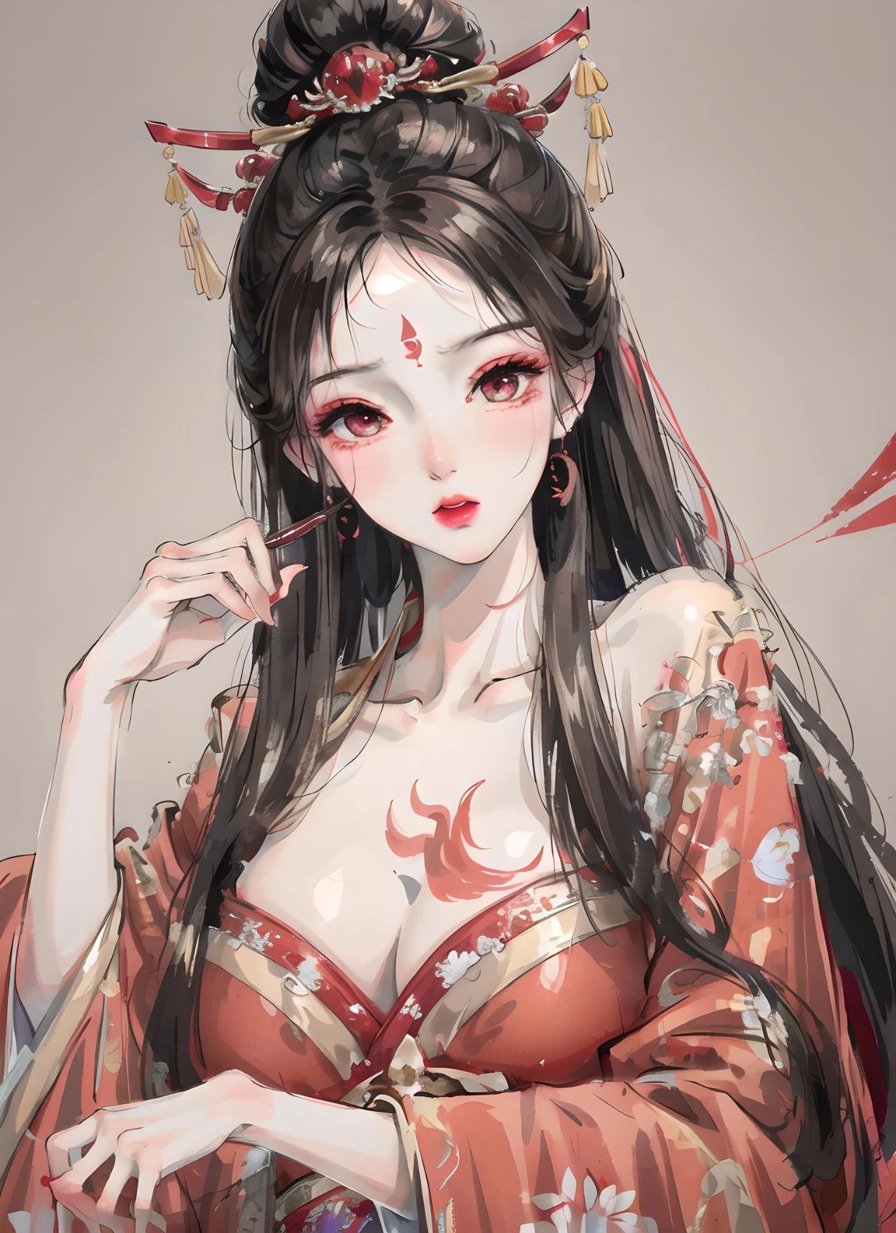 图一关键词:大师作品,最高画质,杰作,女性,华丽的汉服,绣花图案,红色汉服,发簪步摇,妆容精致,美丽,精致的五官,完美的脸,发光的皮肤,桃花眼,细长眉