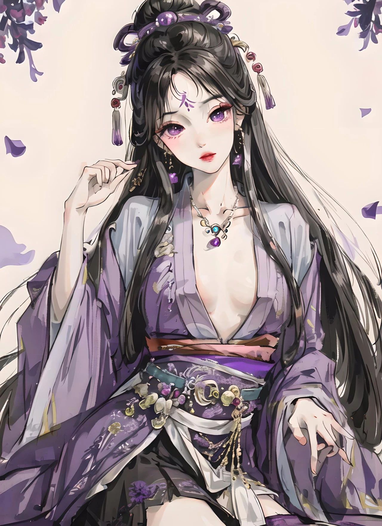 图八关键词:大师作品,最高画质,杰作,女生,汉服,(((紫色汉服))),图腾图案,发簪步摇,珠宝首饰,黑长直发,口红,美丽,精致的五官,完美的脸,发光的皮肤