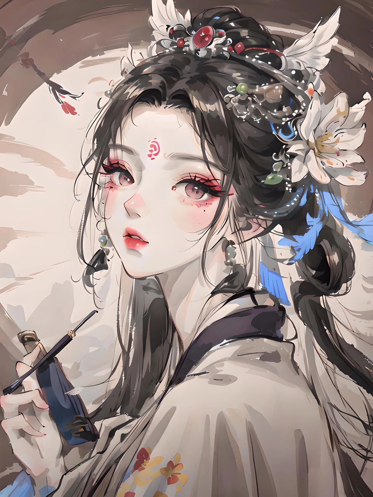 图二关键词:大师作品,最高画质,杰作,女生,华丽的汉服,鸟衔花草纹,白色汉服,发簪步摇,妆容精致,美丽,精致的五官,完美的脸,发光的皮肤,丹凤眼,细长眉