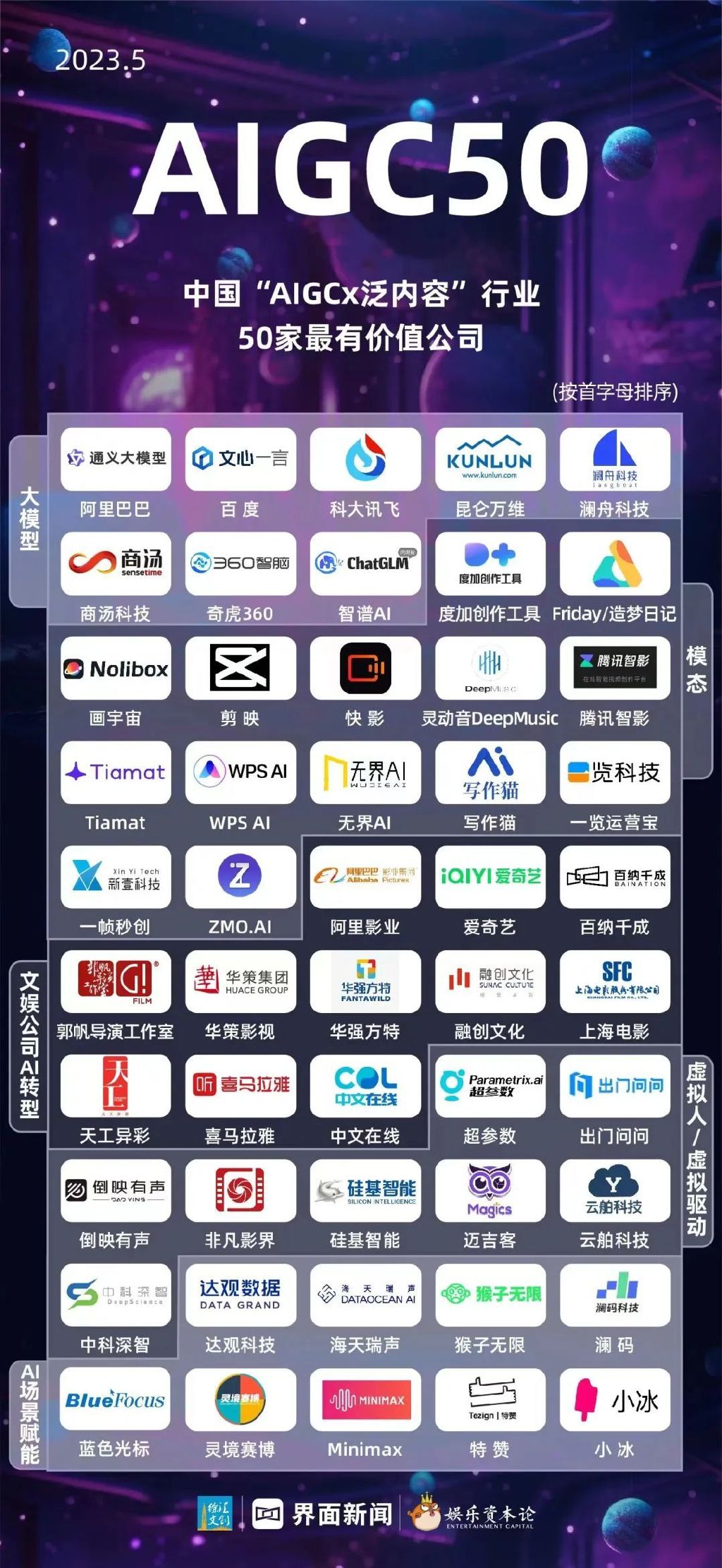 6 月 12 日,界面新闻、娱乐资本论和上海市徐汇区文化旅游服务和发展中心,共同举办了“娱乐 + AI”的主题活动——《AIGC 浪潮下的文娱科创新视野》暨“首届上海文娱科创沙龙”,并在活动中正式发布 AIGC 50 榜单,提名了中国“AIGC× 泛内容”行业 50 家最有价值的公司,无界 AI 入选其中。