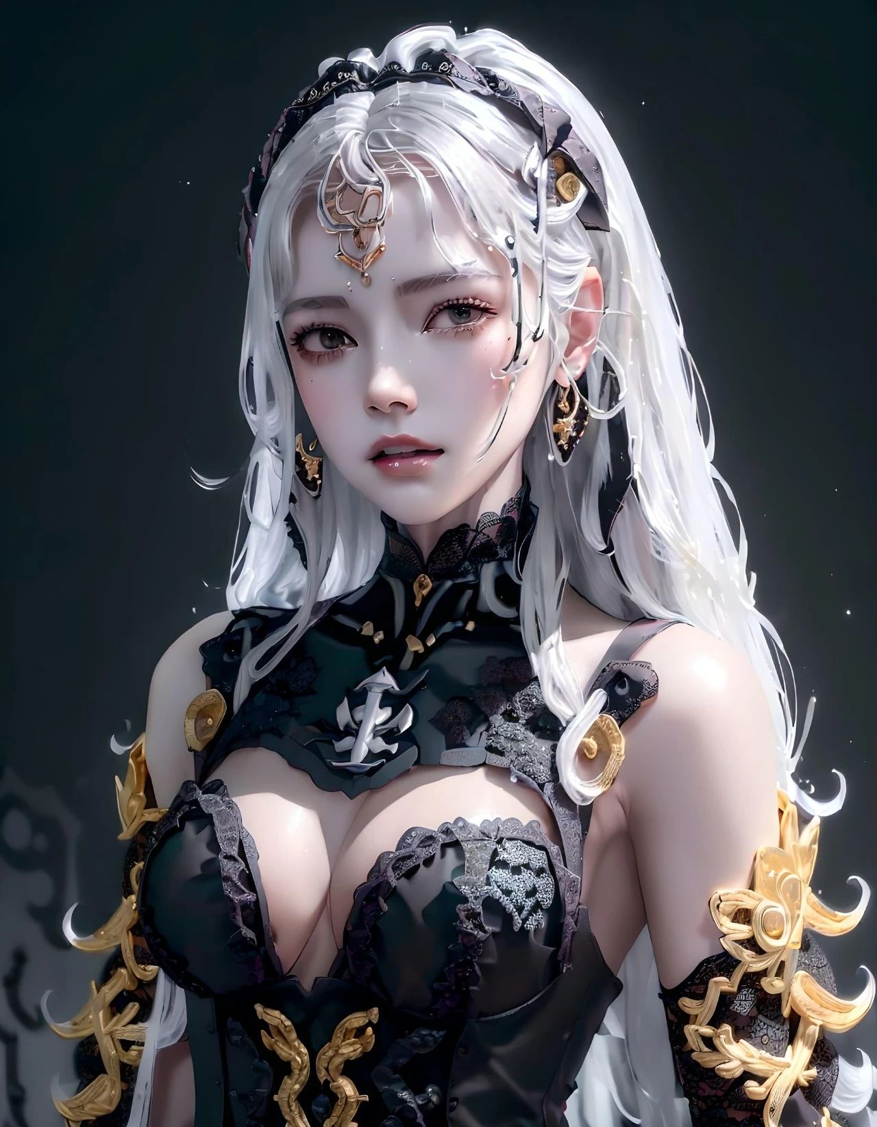 图3:female, solo, absurdres, official art, extremely detailed CG unity 8k wallpaper, best quality, exquisite facial features, prefect face, long hair, in summer, shiny skin, cowboy shot, aqua eyes, seductive smile, ((((melt)))),(((((black and white melt))))),(((wear Black and white Taoist robes))),((((gold and silver lace)))),(((gold and silver lace lace))),(((flowing ((black)) and white background))),extremely detailed gorgeous tiara, rebecca (cyberpunk)