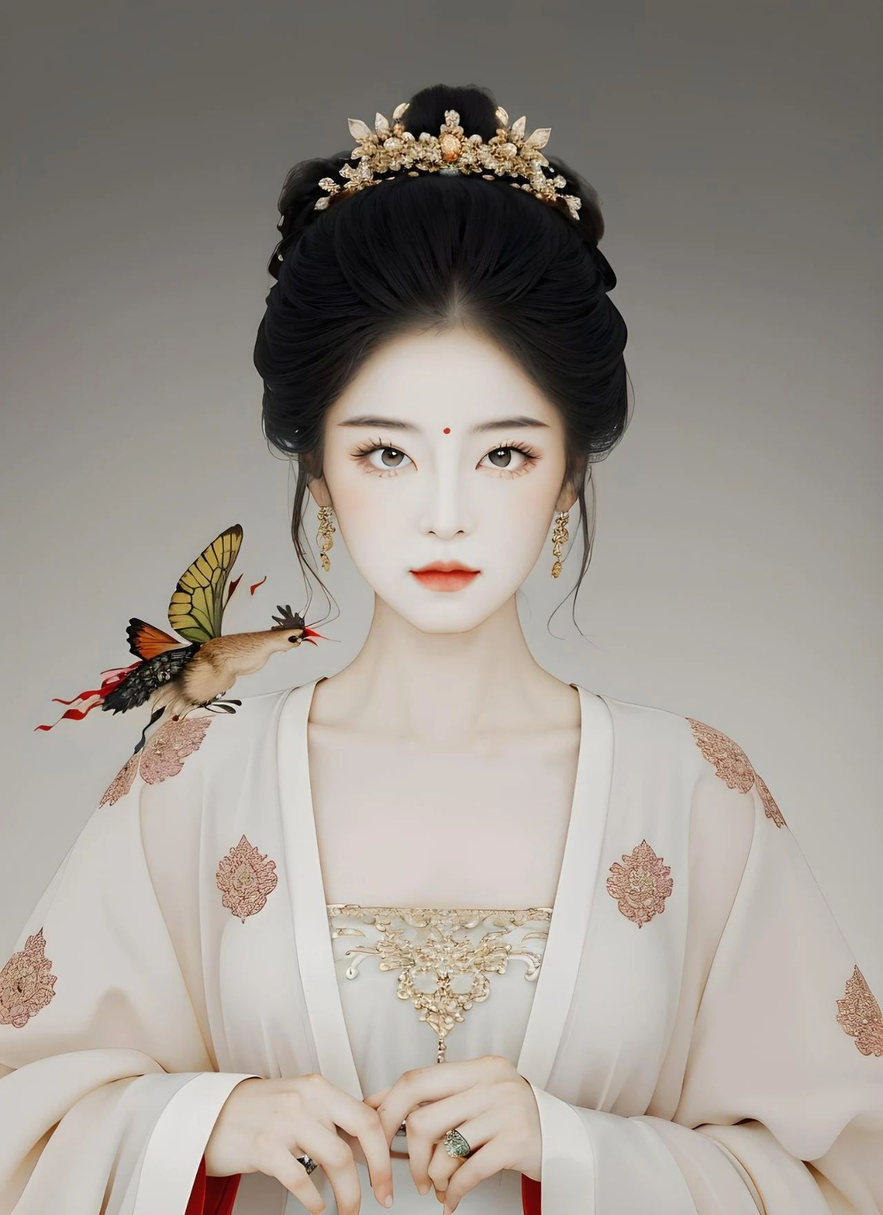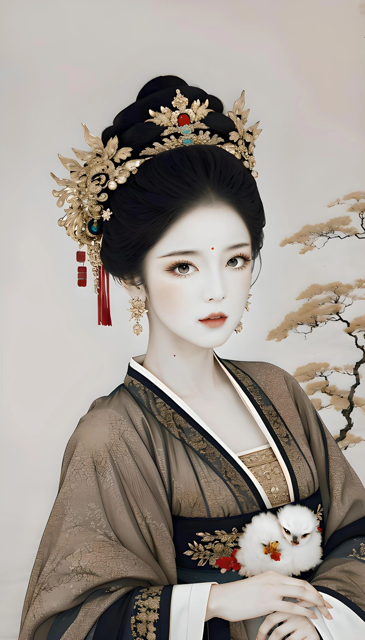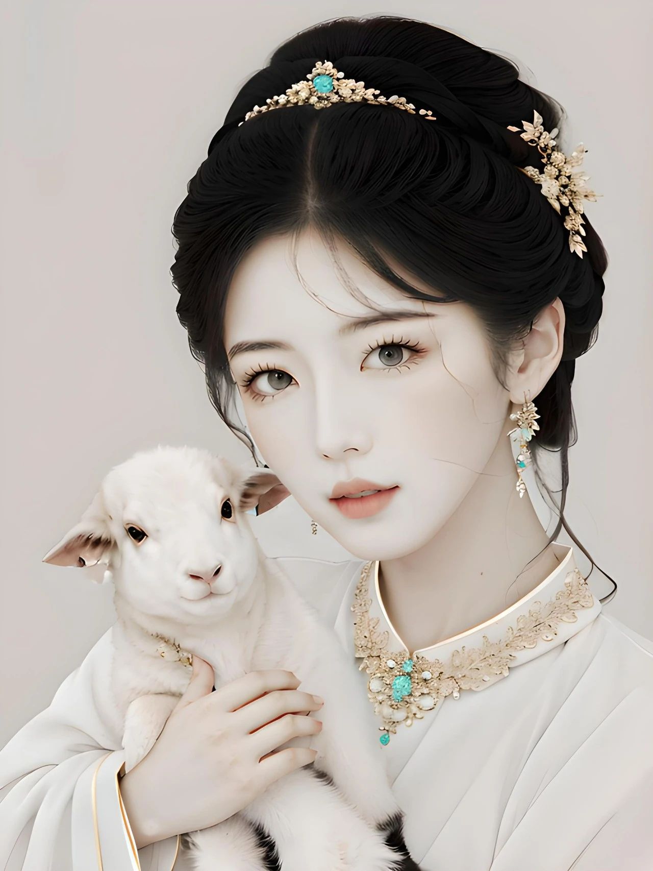 图一:一个漂亮的女孩,抱着小羊羔,细腻皮肤,华丽服装,发饰,耳坠,项链,花钿,超级细节,国潮配色,真实照片,电影灯光