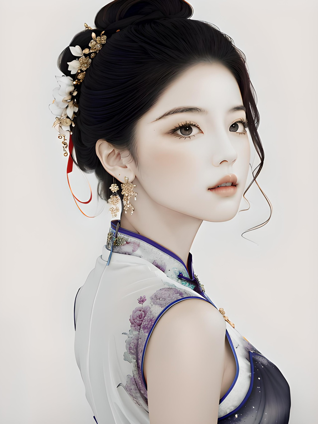 图三:顶级画质,高分辨率,精美绝伦的五官刻画,精致的五官,水嫩白皙细腻的肌肤,精美发型,耳环,细节优化,唯美,一个女孩,(无袖有领丝质透明旗袍苗条身材),性感迷人,紫色玫瑰,水墨,泼墨,中国画,水墨画,(紫色的旗袍:1.5),面对镜头
