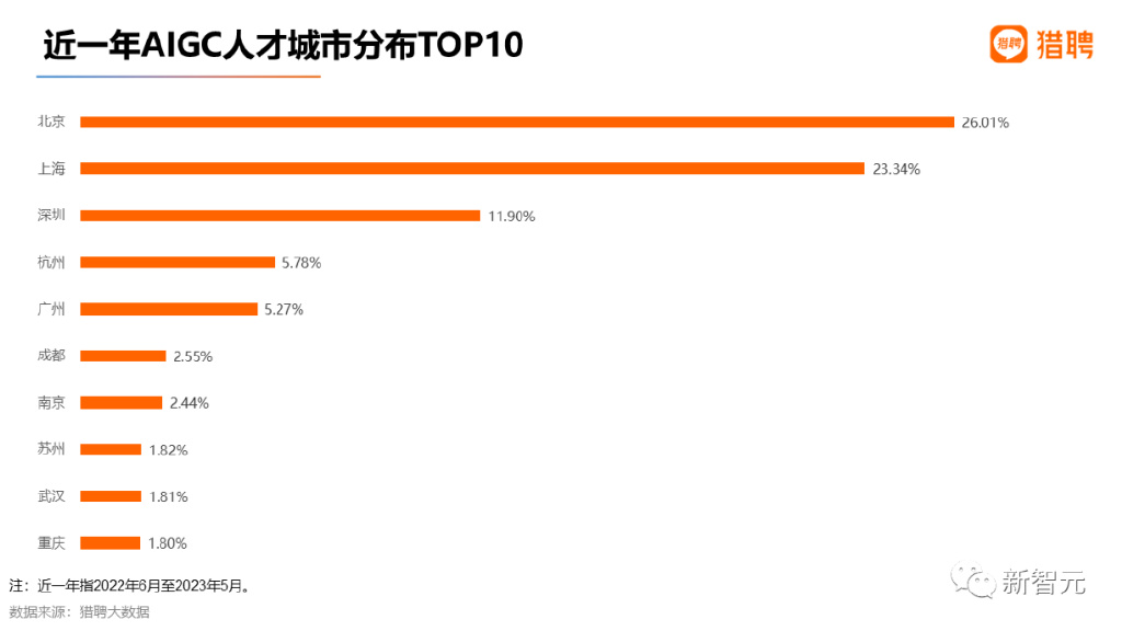 在近一年AIGC人才城市分布TOP10中,北京、上海位居前二,占比为26.01%、23.34%,合计为49.35%。