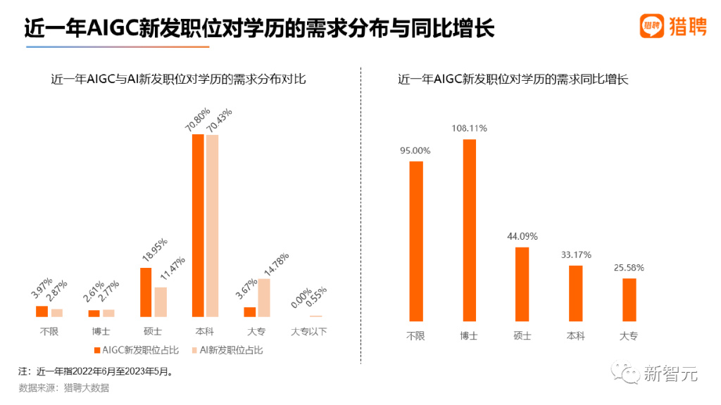 在对高学历需求方面,AIGC明显高于AI,前者对硕博的需求占比合计21.56%;后者为14.24%。