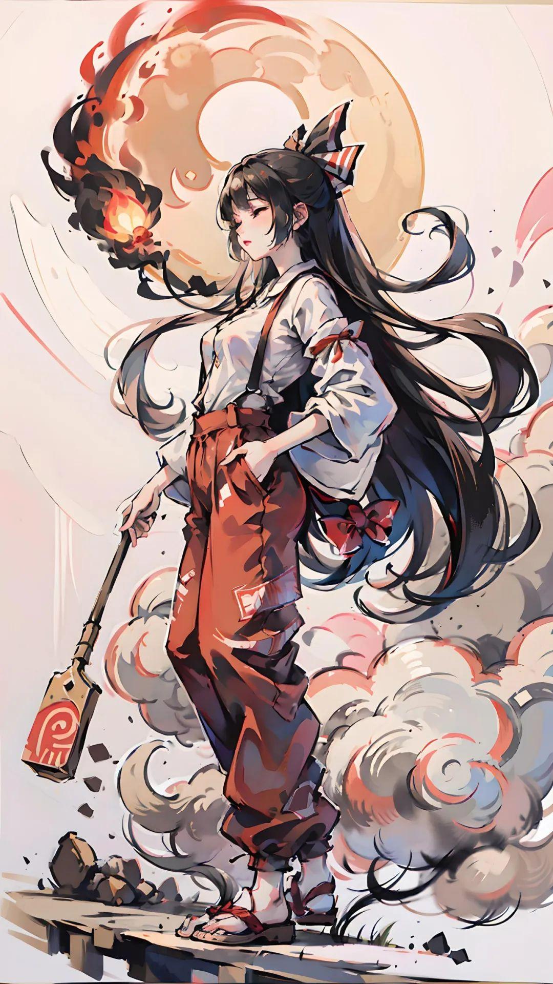 图8:1girl,absurdly_long_hair,baggy_pants,bangs,bow,closed_eyes,cloud,floating_hair,hair_bow,hair_ribbon,hands_in_pockets,letterboxed,long_hair,moon,ofuda,outdoors,pants,red_pants,ribbon,shirt,silver_hair,sky,solo,suspenders,very_long_hair,white_bow,white_shirt,(Fujiwara no Mokou:1.5)