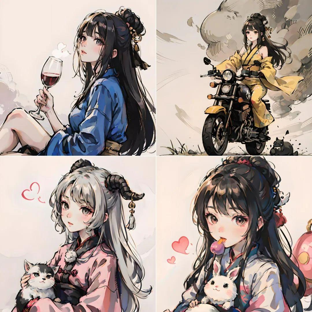 今天小编试了试风格模型-画风 · 流光溢彩,古装打扮、拿着红酒杯的肆意少女,一身汉服、骑着摩托的快意少女……用来做头像,那是最好不过的了!