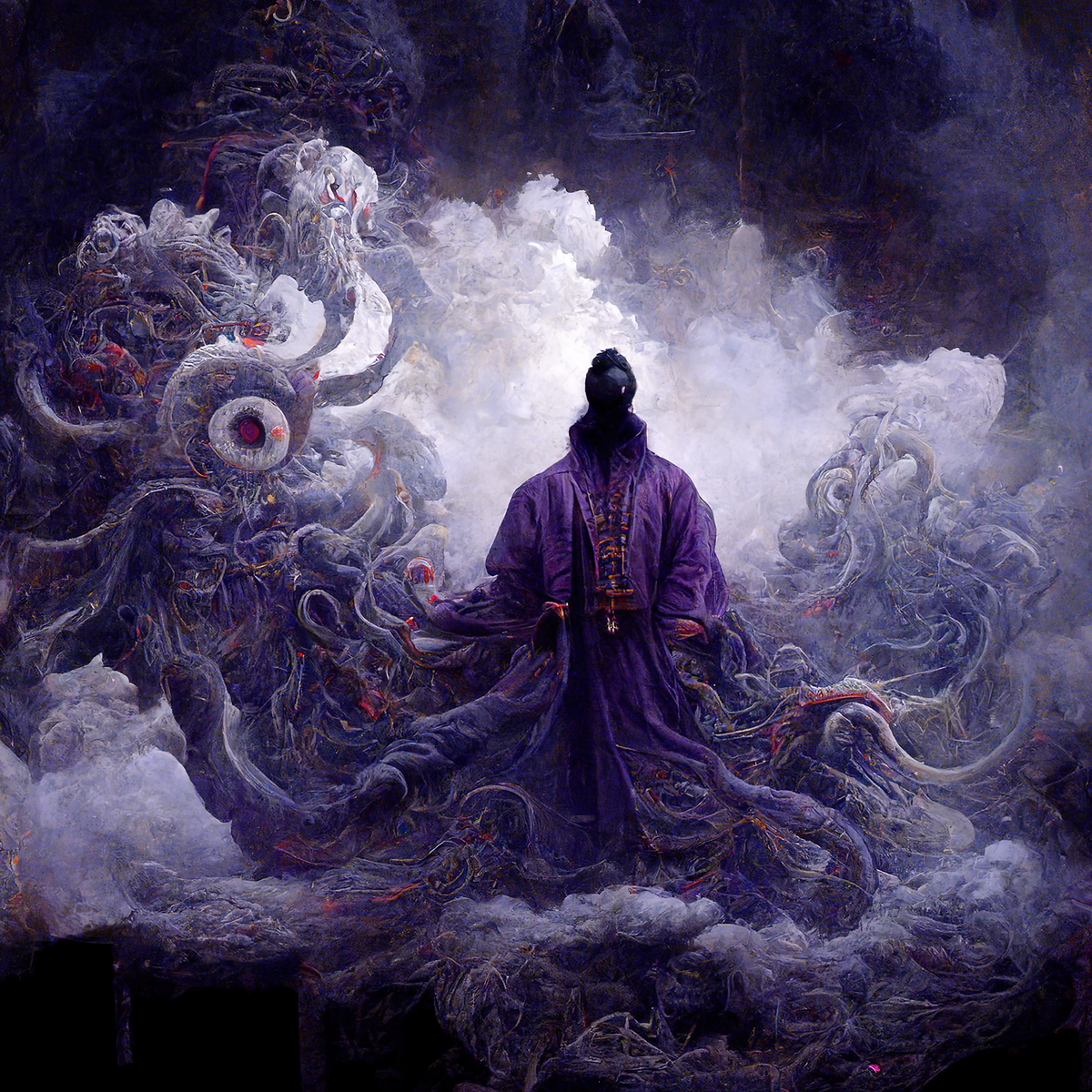 于是基于这种研究方向,作者结合当时 AI 绘画工具自身“缺乏精细化人物描述,但擅长抽象写意的场景构建”的创作特点,将西方知名的“克苏鲁”世界观,与中国古典服饰、宗教,以及视觉氛围进行了融合。