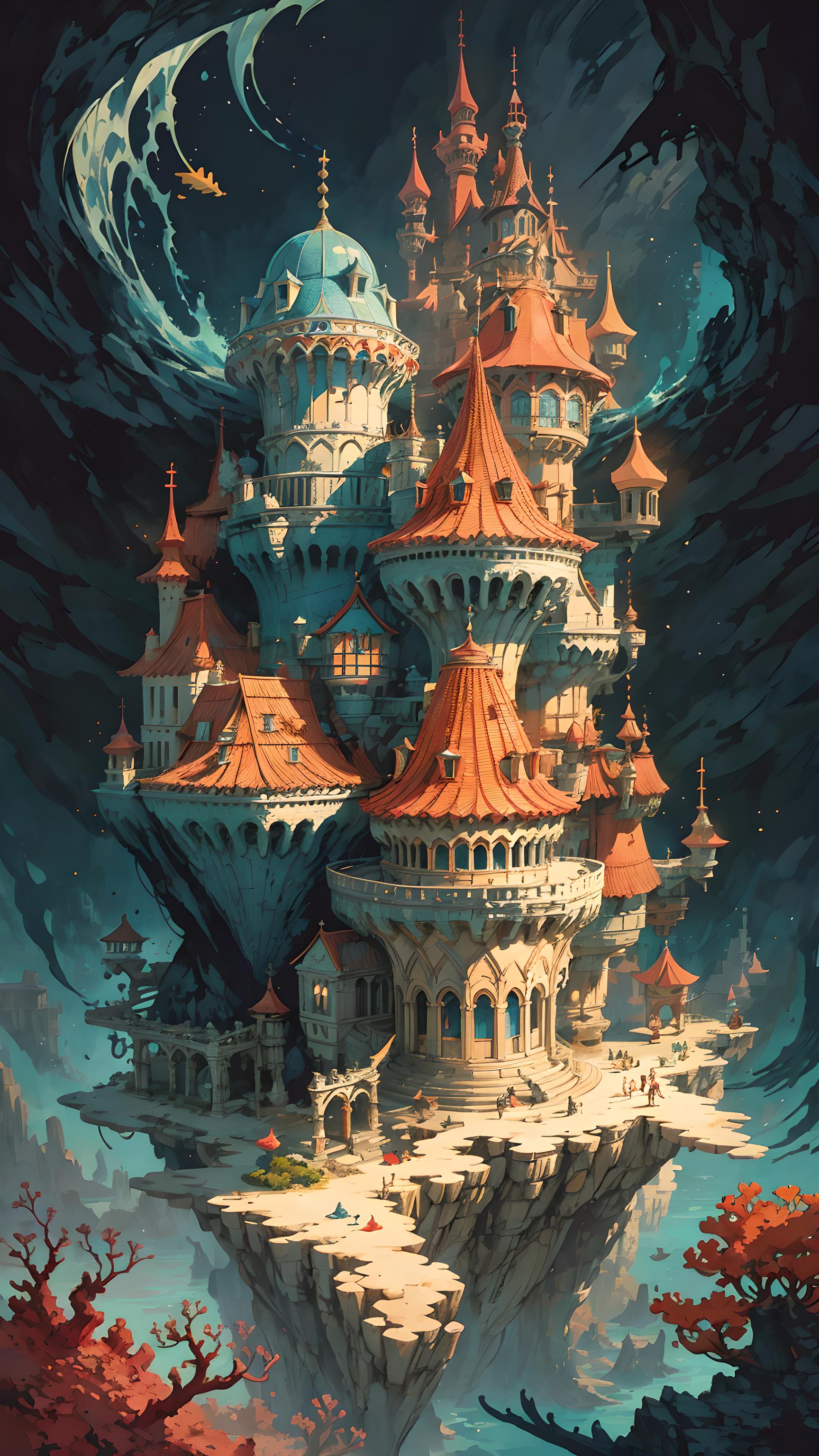 奇幻、魔法、童话、电影动画风格、海底魔法城堡。