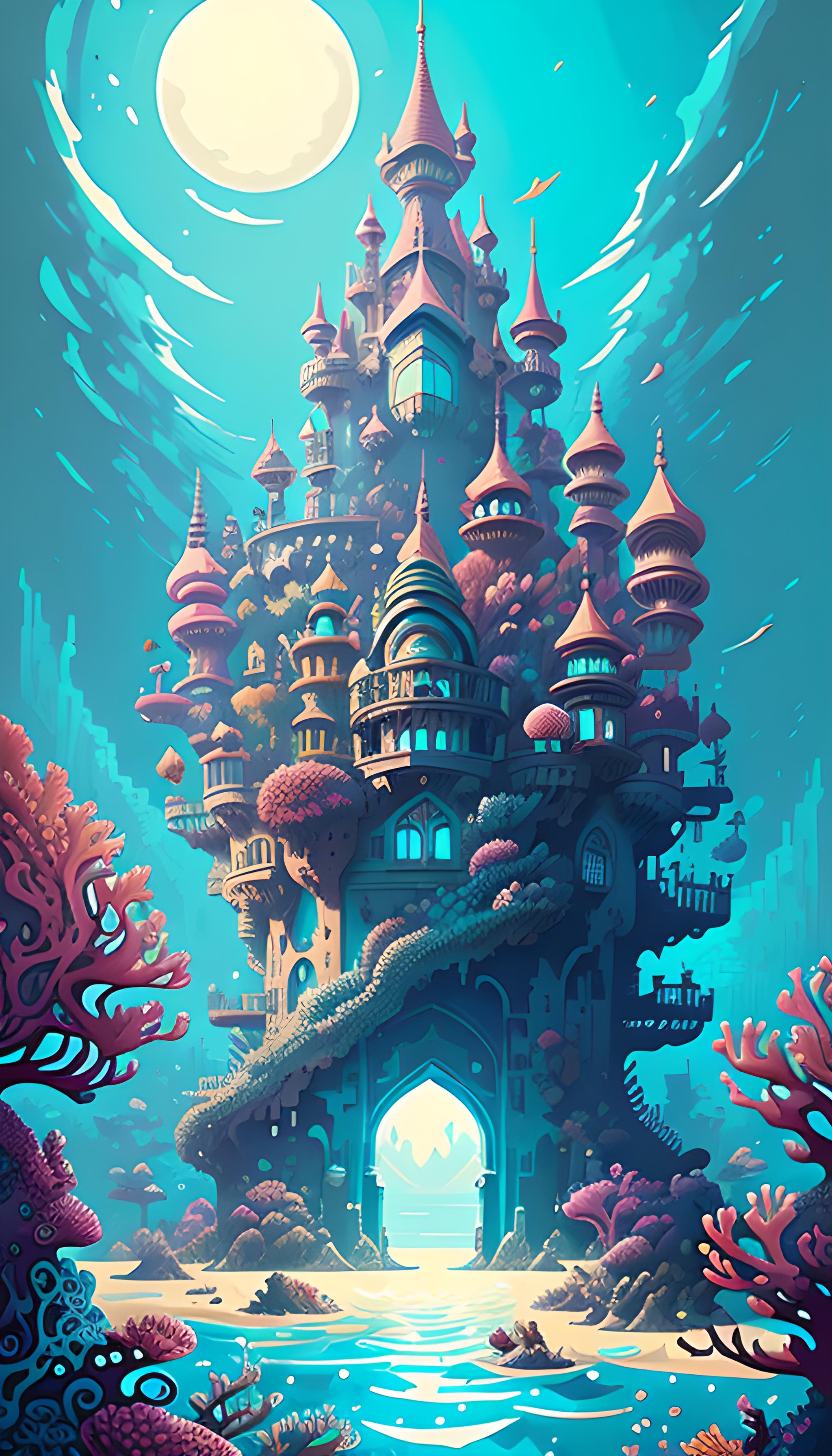 奇幻、魔法、童话、电影动画风格、海底魔法城堡。